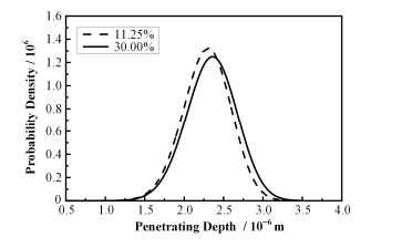 图 6为糙米内空洞体积所占不同比时,N+与靶原子H碰撞的穿行深度概率密度曲线。由文献[20],植物种子内空洞的体积占10%-30%。图 6中,虚线为空洞体积占11.25%,实线为空洞体积占30%。概率密度分布曲线最高峰处代表着最概然穿行深度,由图 6可知,当糙米内部空洞所占的比例较大时,N+的最概然穿行深度较大,并且空洞体积所占的比例越大,则峰高越矮半峰宽越大,N+的概率密度分布越均匀。这说明在注入离子的穿行过程中所遇到的阻碍越小,空洞的存在加大了注入离子的穿行深度。