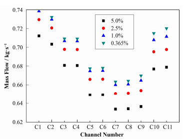 图 6 各个通道内质量流 Figure 6 The mass flow in each fuel assembly |