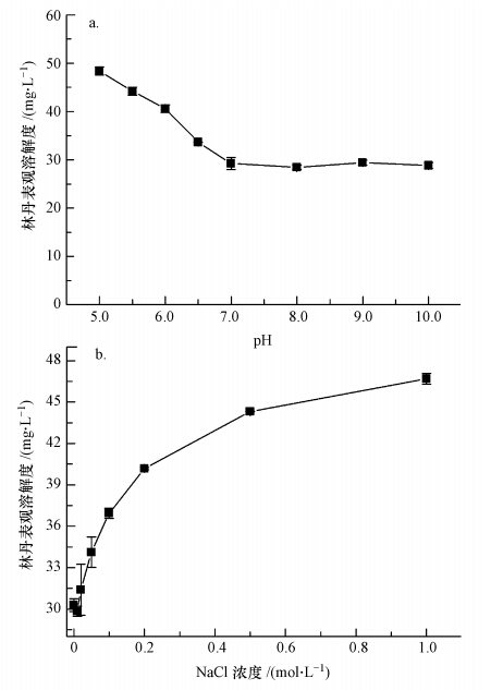 由图 2a可知,pH对鼠李糖脂的增溶作用有较大影响.pH为5.0时增溶效果最好,对应林丹的表观溶解度为48.3 mg · L-1;随着pH的提高,林丹的表观溶解度直线降低;pH为7.0时,林丹的表观溶解度降低至29.3 mg · L-1;而pH从7.0提高到10.0时,鼠李糖脂的增溶效果基本保持稳定.这种变化主要与不同pH条件下鼠李糖脂胶束结构的变化有关.Champion等(1995)利用电子显微镜观察了 pH在5.5~8.0范围内鼠李糖脂的不同形态及转化情况,研究发现,pH为5.5~6.0时,鼠李糖脂在溶液中主要以菌褶形式存在,pH=6.0~6.8时囊泡为主要形态,pH=6.8~8.0时囊泡逐渐消失,胶束结构占绝对比例.结合本实验可知,鼠李糖脂的菌褶结构对林丹的增溶更为有效;另一方面,由于鼠李糖脂的酸碱平衡常数pKa约为6.8,当pH 由中性到碱性时,更多的鼠李糖脂分子带有负电荷,向外的亲水基团之间的静电排斥力增大使得胶束压缩变小,因而增溶能力变小(万金忠,2011).故实验当中随pH增大,鼠李糖脂对林丹的增溶能力下降,当pH大于7.0之后,鼠李糖脂对林丹的增溶能力降到最低.
