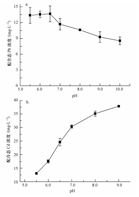 | 图 4 pH对鼠李糖脂配合Pb(a)和Cd(b)的影响 Fig. 4 Effect of pH on the complexation of Pb(a) and Cd(b)with rhamnolipids |