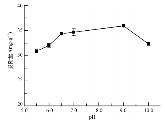 由图 6可知,当pH从5.5上升至9.0时,鼠李糖脂在土壤上的吸附量略有增加,而pH在7.0~9.0范围内鼠李糖脂在土壤上的吸附量增加趋势放缓.当pH为9.0时,土壤吸附的鼠李糖脂占41.1%,达到最大,而当pH达到10.0后,吸附量有所下降,鼠李糖脂吸附损失为29.4%.