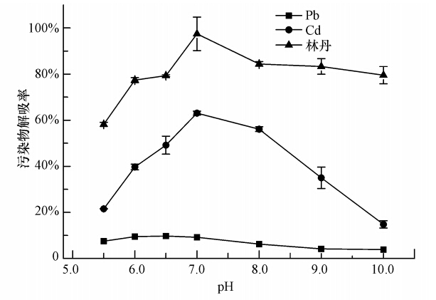 如图 8所示,pH对3种污染物去除率的影响趋势大体相同,当体系pH从5.0上升到7.0时,污染物去除率增加,而随pH继续升高,污染物的去除率下降,其中,Cd的下降速度最快.pH为7.0时,鼠李糖脂对污染物的去除达到了最佳效果.pH主要通过改变鼠李糖脂及污染物在土壤上的吸附行为,改变水相中鼠李糖脂形态结构及其与污染物的相互作用等方面来影响李糖脂解吸复合污染物的效果.其一,随着pH的增加,土壤有机质的溶解性显著提高,污染物分子在土壤上的吸附减弱,因此,有利于污染物的解吸(罗玲等,2004);而pH超过7.0时,重金属容易形成沉淀,溶解性显著降低,又会抑制污染物释放.其二,pH升高后鼠李糖脂的吸附呈现出先增加后降低的趋势,相应地,对污染物解吸表现为先降低后升高.其三,pH升高,鼠李糖脂对林丹的增溶能力下降,对Pb的配合能力下降,而对Cd的配合能力持续上升.通过以上3方面因素的综合分析,不难得出,pH对鼠李糖脂淋洗复合污染土壤的影响结果与第一个因素(即pH对土壤中污染物吸附行为的影响)有一定的一致性.当pH值超过7.0之后,鼠李糖脂在土壤上的吸附量继续增加,有效浓度降低,而重金属移动性变差,故污染物解吸率降低.总体而言,pH对鼠李糖脂淋洗复合污染土壤的影响较为复杂,实验得到的最优淋洗pH为7.0左右.