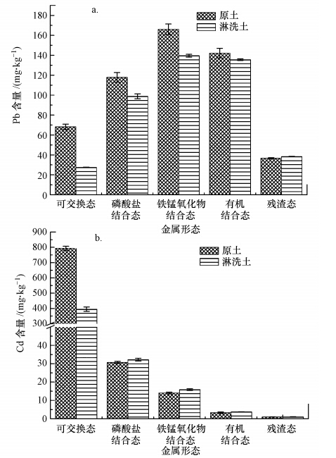 | 图 9 淋洗前后土壤中Pb(a)和Cd(b)各形态含量变化(鼠李糖脂加入浓度为10000 mg · L-1) Fig. 9 Speciation of Pb(a) and Cd(b)in the soils before and after washing treatment(rhamnolipids concentration was10000 mg · L-1) |