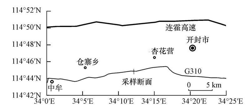 采样路段位于黄淮平原中西部,海拔高度在70 m左右,地势开阔、平坦.土地利用方式为农田,种植作物主要为小麦、花生和西瓜等.远离城镇,工业活动对土壤的影响轻微.气候类型属暖温带大陆性季风气候,冬季盛行东北风,夏季盛行南风,年均气温14 ℃左右,年均降雨量600 mm左右,地下水位较浅,周年变化在2~3 m之间.采样断面的土壤为黄潮土(淡色湿润雏形土),质地以砂壤土为主.经作者野外采样和实验室分析,采样路段土壤砂粒(粒径d>0.05 mm)、粉粒(0.05 mm>d>0.002 mm)和黏粒(d<0.002 mm)平均含量分别为530、310和160 g · kg-1,有机质平均含量为29.29 g · kg-1,pH值平均为7.9.