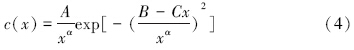 根据《环境影响评价技术导则 大气环境》(HJ/T 2.2-93),在不同的大气稳定度下,α为一系列的非连续的几个值,A、B和C均为正数.为了便于研究,本文只讨论公式(6)中n=1的情况.采用Matlab 7.0.1编程,用实测数据逐步拟合法推导A、B、C和α.首先确定各个参数数量级,然后经过多次回归从最高位到低位逐渐拟合参数.