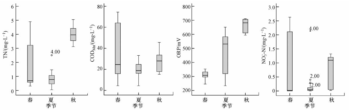 从变异幅度来看,CODMn、TN、NO-3-N最大变异幅度均发生在春季,表示春季人工湿地对有机、营养物质的处理效率波动较大.ORP最大变异幅度出现在夏季,这是由于ORP能直接对微生物活性造成影响,并由此影响湿地的整体脱氮效果(王泉等,2011),夏季水体氧化还原电位的剧烈变动湿地植物根际频繁的微生物活动.