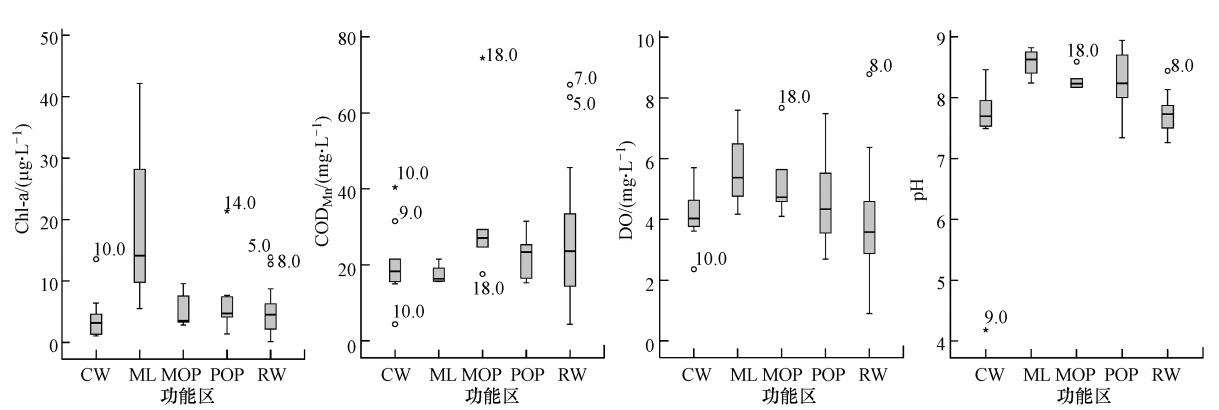 分别将RW、CW、POP、MOP、ML区赋值1~5,Spearman相关分析结果见表 4.可看出空间性方面,DO、pH与空间相关性显著(p< 0.01),Cl -、TN与空间相关性显著(p<0.05).将Spearman相关分析与判别分析结果对比得出,Cl -、TN与空间相关性显著却不能被空间判别分析所识别,这可能是由于奥林匹克森林公园人工湿地各功能区均为多个处理单元并联的人工湿地,单元之间通过进出水阀井连接和控制,致使污染物浓度和分布随着开关阀的时间和频次而有所变动,Cl-、TN波动大,丧失判别能力,同时表示这两项指标受人为影响较大.另一方面,Chl-a、CODMn与空间相关性不显著,但却能够被判别分析所识别,表明这两项指标的显著变动仅发生某些特定的功能区而非整个人工湿地,具体情况需通过箱线图进一步解释.