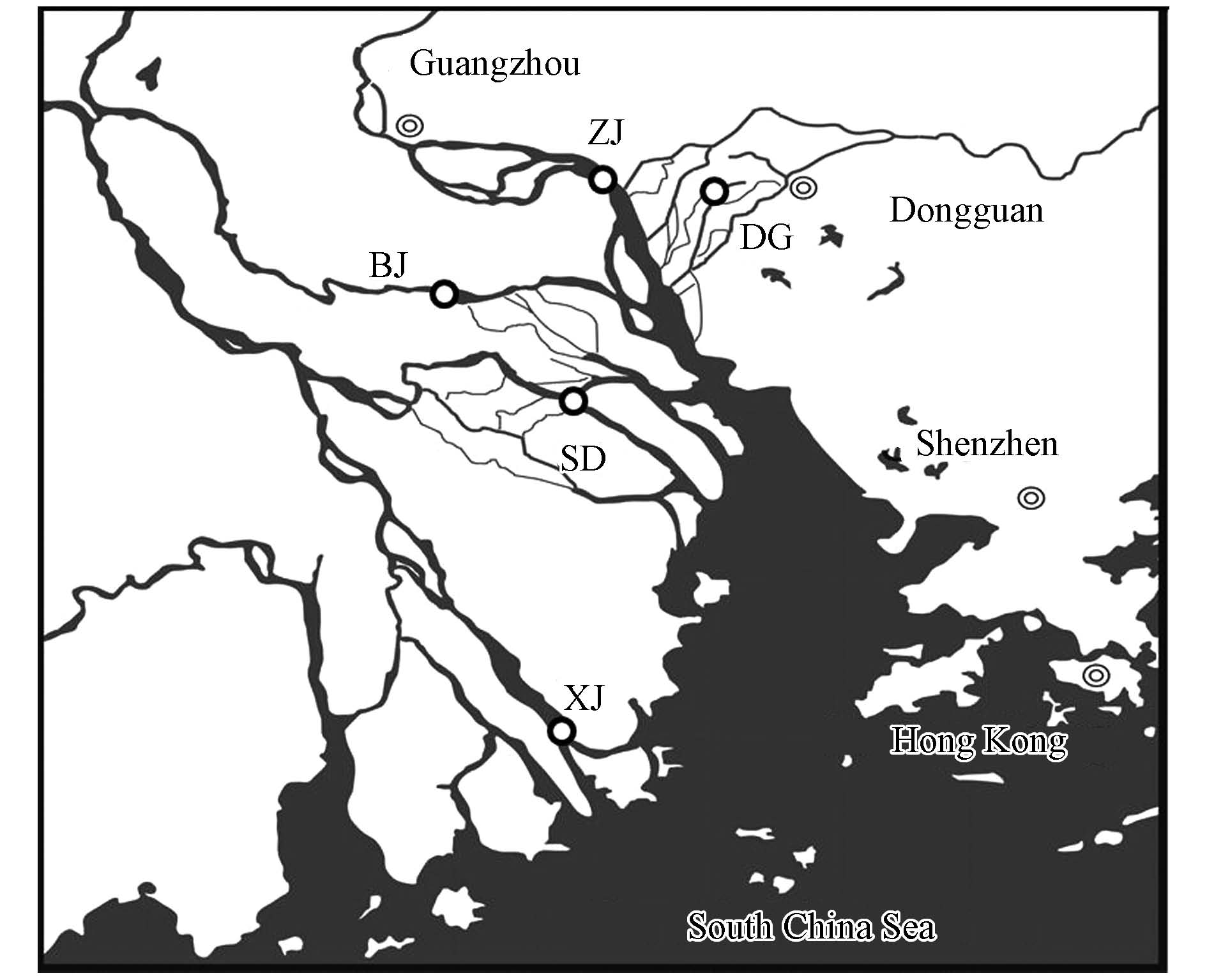 | 图 1 珠江三角洲5个钻孔位置图 Fig. 1 The sampling locations for sediment cores across the Pearl River Delta |