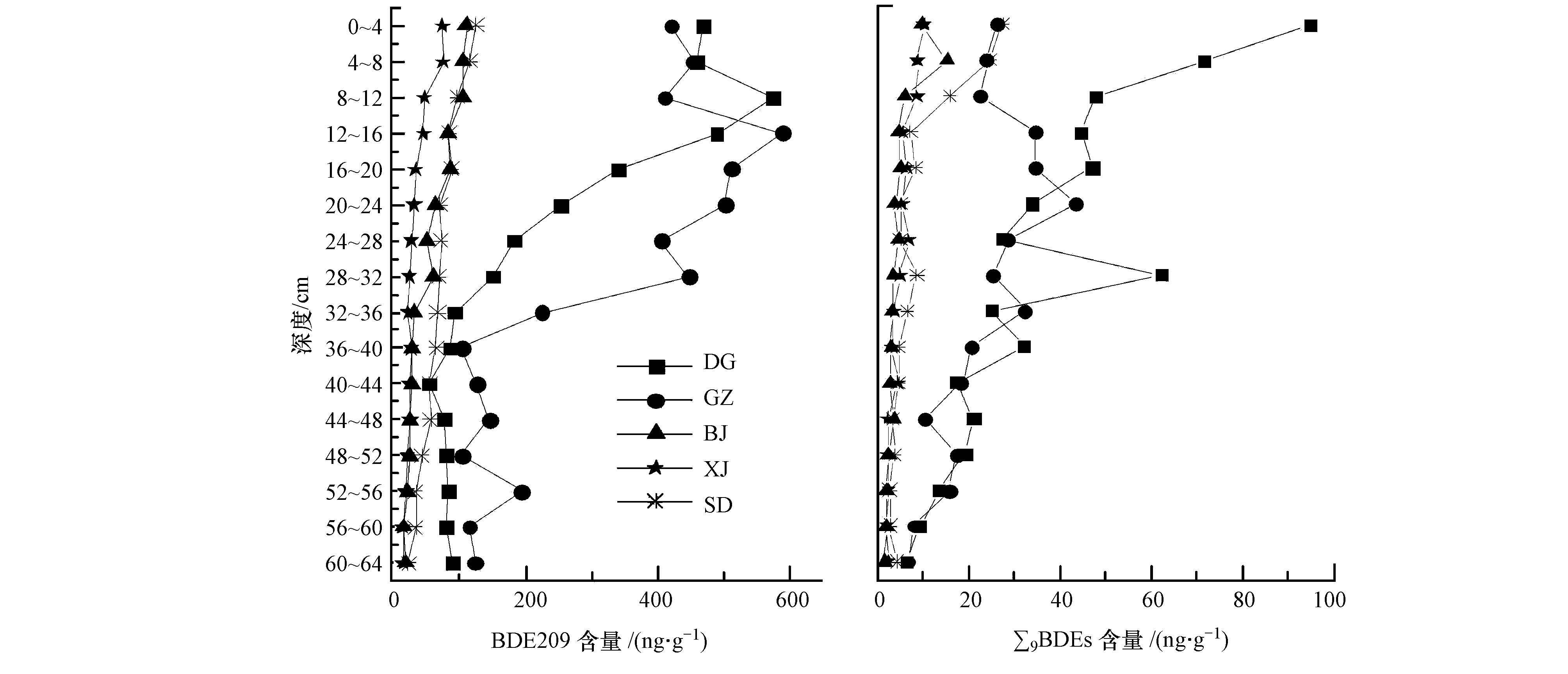 | 图 2 钻孔中的BDE209和∑9BDEs的垂直变化趋势 Fig. 2 Temporal trends of BDE209 and ∑9BDEs concentrations in sediment cores |