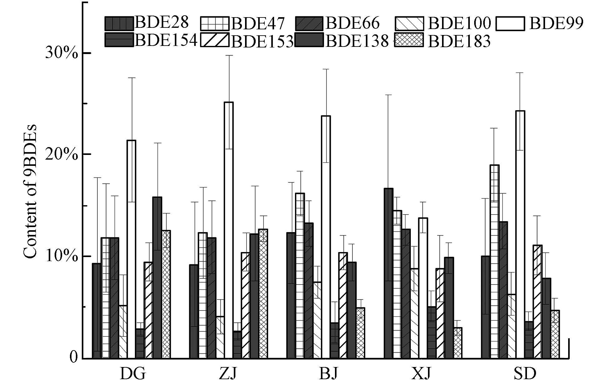 | 图 3 珠江三角洲钻孔中∑9BDEs的同系物组成 Fig. 3 Congener profiles of ∑9BDEs in the sediments cores in the Pearl River Delta |
