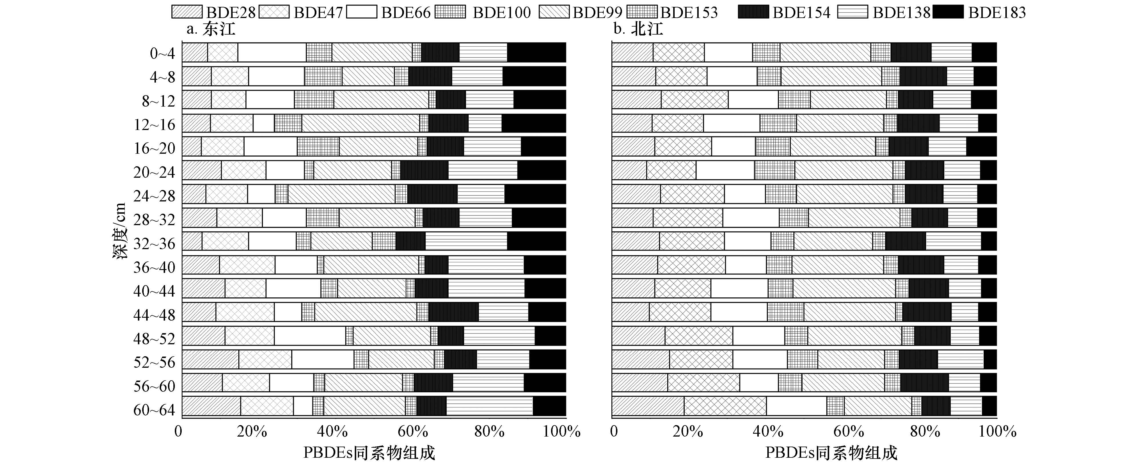 | 图 4 珠江三角洲东江东莞段和北江钻孔中PBDEs的同系物组成 Fig. 4 Congener profiles of PBDEs in the sediments cores in the Pearl River Delta |