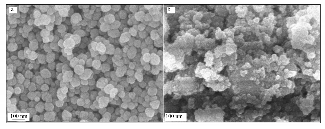 | 图 1 Fe3O4NPs(a)和Fe3O4MMPs(b)的SEM图 Fig. 1 SEM images of Fe3O4NPs(a) and Fe3O4MMPs(b) |
