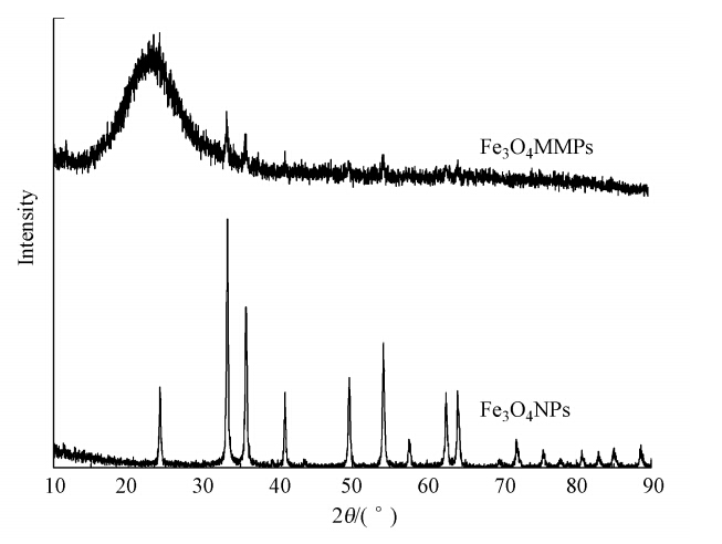 | 图 2 催化剂改性前后XRD图 Fig. 2 XRD patterns of Fe3O4NPs and Fe3O4MMPs |