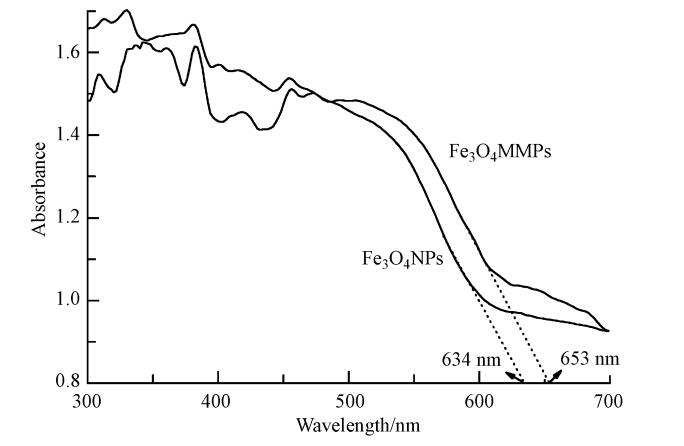图 3是Fe3O4NPs和Fe3O4MMPs的DRS图.根据公式Eg=1239/λ(其中,Eg为半导体的禁带宽度(eV),λ为半导体吸收边的波长(nm))可以计算出半导体的禁带宽度(Xu et al., 2011).从图 3中可以看出,Fe3O4NPs和Fe3O4MMPs吸收边的波长分别为634 nm和653 nm,计算得到它们的禁带宽度分别为1.95 eV和1.90 eV.结果表明,改性前后禁带宽度几乎不改变,改性后的Fe3O4MMPs在可见光区的吸收提高可能是由于改性剂的影响所致.