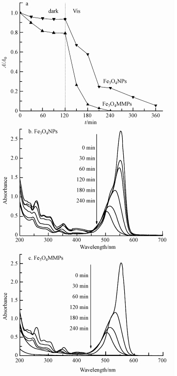 3.2 Fe3O4NPs和Fe3O4MMPs降解罗丹明B图 4为Fe3O4NPs和Fe3O4MMPs对罗丹明B的吸附和降解动力学曲线.从图 4a中可以看出,达到吸附平衡时Fe3O4NPs对罗丹明B的吸附量很小(<5%),而改性后的Fe3O4MMPs对RhB的吸附量增大,达到20%.同时,在可见光照射下,Fe3O4NPs在引入光照240 min后对RhB的褪色率仅为75%(图 4b);而Fe3O4MMPs在光照120 min后能使RhB完全褪色(图 4c).结果表明,改性后的Fe3O4MMPs比表面积增大导致其对RhB的吸附增强,进一步促进其降解.通过跟踪测定降解过程中RhB吸收峰的变化,发现RhB的吸收峰逐渐蓝移,推断Fe3O4MMPs对RhB的降解是逐渐脱乙基的过程(Wu et al., 1998).