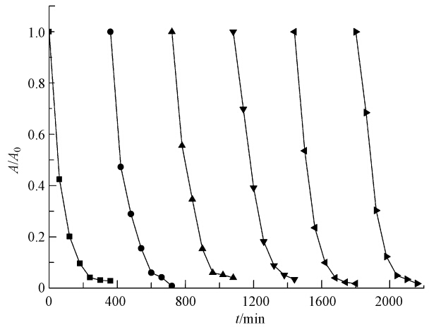 | 图 5 Fe3O4MMPs循环降解罗丹明B([RhB]=3.1×10-5 mol · L-1,[Fe3O4MMPs]=0.3 g · L-1,[H2O2]=2.9×10-4 mol · L-1,pH=7.4) Fig. 5 Cycling removal of RhB by Fe3O4MMPs |
