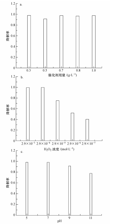 | 图 7 催化剂的用量(a)、H2O2浓度(b)和pH(c)对罗丹明B降解的影响 Fig. 7 Effect of catalyst dosage(a),H2O2 concentration(b) and pH(c)on the removal of RhB |