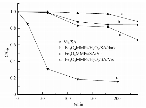 | 图 8 Fe3O4MMPs降解水杨酸([SA]=5.9×10-5 mol · L-1,[Fe3O4MMPs]=0.3 g · L-1,[H2O2]=2.9×10-4 mol · L-1) Fig. 8 Removal of SA by Fe3O4MMPs |