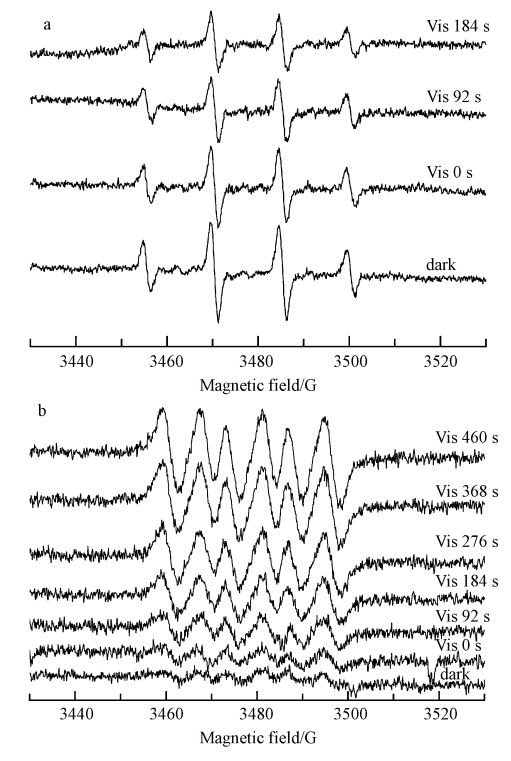 2.5 羟基自由基(· OH)和超氧自由基(· O-2)的测定用DMPO自旋捕捉顺磁物质,获得的电子自旋共振ESR信号在室温下(298 K)通过波谱仪进行记录,光源为Quanta-Ray ND:YAG脉冲(10脉冲每秒)激光系统(λ=532 nm,10 Hz).仪器中心磁场强度为3486.70 G,扫场范围100.0 G,微波频率为100 kHz,功率为10.02 mW.为了减少误差,在测定过程中使用同一支石英毛细管.