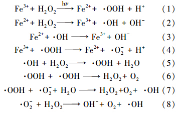 基于以上实验结果和氧化物种的测定,提出可能的反应机理为:类似于传统的Fenton反应,本实验中Fe3+催化分解H2O2产生具有一定氧化能力的自由基· OOH,同时,Fe2+催化分解H2O2产生具有很强氧化能力的氢氧自由基· OH,并引发产生更多的其它自由基氧化有机物分子,使之矿化降解为CO2、H2O等无机物质(Walter et al., 1997;Walling et al., 1973;刘东莲等,2003).其详细的反应机理推测如下: