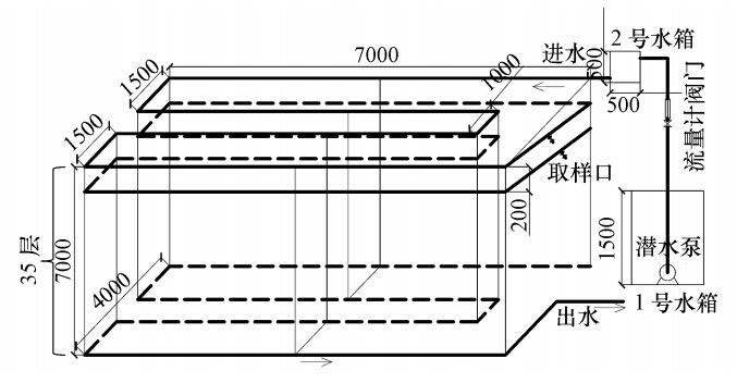 2 材料与方法(Materials and methods) 2.1 试验装置污水管道模拟反应器如图 1所示.模拟管段试验装置主体由管径25 mm的PVC管构成,总有效长度1200 m,为了充分模拟实际污水管道重力式水流状态,坡度设为5‰.管材内壁用砂纸适当打磨,以控制管道沿程阻力系数及雷诺数,使其与钢筋混凝土管的粗糙度相接近,从而保证流动特性与钢筋混凝土管相仿.模拟管段共有35层,层与层之间通过尺寸为50 mm×30 mm(直径×高)的圆柱形检查井连接,检查井材质为有机玻璃.每层模拟管段上均设有取样点,为了便于观察模拟管段内的水流状态,取样点两侧设有活结连接的长为500 mm的有机玻璃管段,每节有机玻璃管段内放置尺寸为500 mm×10 mm×3 mm(长×宽×高)的经适当打磨的有机玻璃试样片1个作为管道生物膜附着载体,同时,模拟管段外部裹有保温材料,使其处于一个避光恒温的环境中.