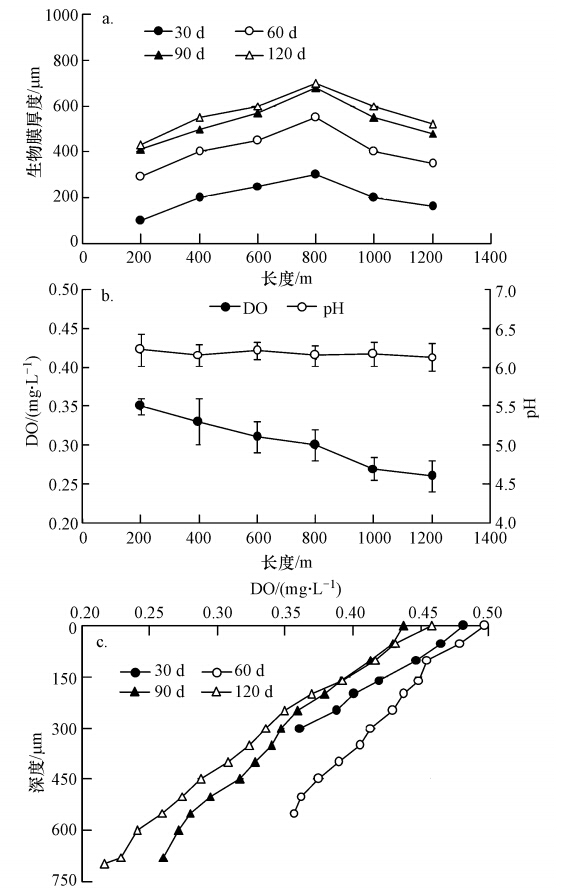 反应器共设6个取样点,分别位于距进水口200、400、600、800、1000、1200 m处.取模拟管段内载片进行生物膜厚度、pH、DO、结构及生物群落检测.模拟管段稳定运行至120 d时,分别取不同模拟管段内载片上的生物膜进行结构及种群分析.