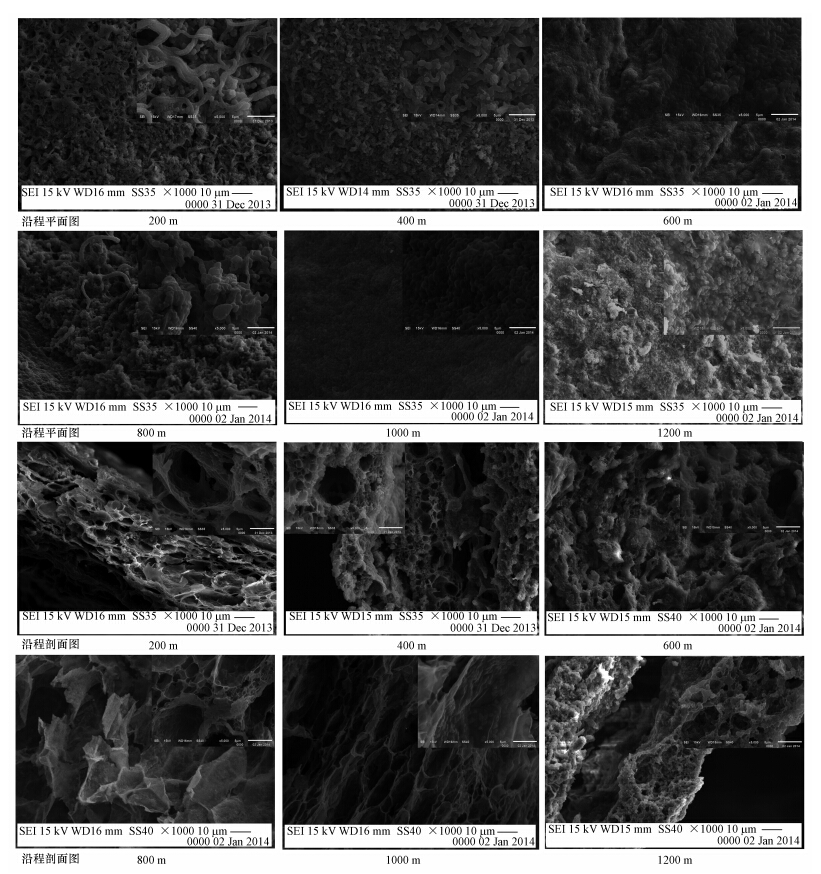 3.2 生物膜结构与菌群构造变化规律利用扫描电镜进一步对生物膜结构及菌群构造变化进行分析,结果如图 3所示.从图中可以看出,在200、400 m处生物膜表面结构平整、均匀且致密;在600、800 m处生物膜表面粗糙凹凸不平且结构疏松,起伏较大;在1000、1200 m处生物膜结构进一步恶化,出现了大量的胞外聚合物,细菌细胞被粘质外鞘包裹起来,此时以各种细胞外化合物构成为主体.