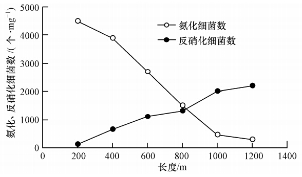 | 图 6 氨化菌、反硝化菌的沿程变化 Fig. 6 Variation of ammonifier and DRB along the length of simulated networks |