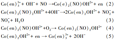 Co(en)33+在溶液中能够络合NO,使其转化成亚硝酸和硝酸混合物(Long et al., 2005),主要反应如下: