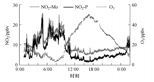 目前,国际上广泛应用的NO2/NOx测量方法是钼转化炉催化转化-化学发光法(Mo-CL)(Demerjian,2000),其主要是利用NOx在325 ℃的钼转换炉中转化为NO,产生的NO继而与O3反应产生化学发光的原理进行检测(Fontijn et al., 1970).之后,国内外的研究人员利用可调谐二极管激光吸收光谱(TILDAS)(Dunlea et al., 2007)、激光诱导荧光(LIF)(Suzuki et al., 2011)、差分吸收光谱(DOAS)(Villena et al., 2012)、光解转化-化学发光法(P-CL)(Steinbacher et al., 2007)及液相反应(LPC)等测量方法(吴方堃等,2010)与Mo-CL方法进行比对,均得出了钼转化炉法测量结果相对于其他方法偏高的结论,并且偏高部分与臭氧及部分气态NOz物种(HONO、HNO3、PANs、烷基硝酸盐等)浓度存在显著相关性.笔者利用Thermo 42i TL NO-NO2-NOx Analyzer和Thermo NOy Analyzer进行比对实验,也得到钼转化炉法将NOx热解的同时也将部分NOz物种转化,从而导致所测NO2及NOx结果偏高的结论(曹玮等,2013).