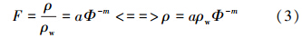式中,ρ土体电阻率(Ω · m);ρw为流体(水)的电阻率(Ω · m);Φ为孔隙率;Sw为含水饱和度;a为地层因子;m为孔隙率指数,即胶结系数,也称孔隙形状因子;n为饱和度指数;a、m、n均为常数.当地下岩土体含水饱和时,定义结构因子F为地下岩土体含水饱和时岩土体电阻率和孔隙水电阻率之比,即: