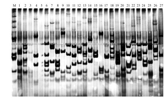 | 图 2 部分phoD片段双酶切PAGE凝胶电泳(M:DL2000 DNA Marker,1~27:部分phoD扩增片段双酶切产物) Fig. 2 PAGE gel electrophoresis of phoD fragment degested by double enzyme(M: DL2000 Marker,1~27:phoD fragment digested double enzyme) |