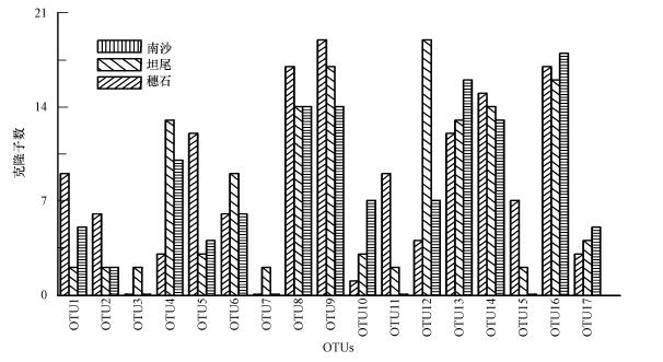 3 个环境样品共得到17个OTUs,穗石、坦尾、南沙3个采样点细菌phoD基因文库分别含有15、17、13个OTUs,并且穗石、南沙两点的OTUs都包含在坦尾样品OTUs中;其中,OTU3和OTU7只在坦尾点出现,坦尾的OTUs种类最丰富,但坦尾的OTU3和OTU7也仅分别含2个克隆子;OTU11和OTU15仅在南沙点中不存在;除上述4个OTUs外,余下13个OUTs在3个采样点所含克隆子数较平均且在3个采样点普遍存在;这17个OTUs中,12个OTUs克隆子数量在10个以上,且占有明显的优势(图 3),不同文库中单次出现的克隆子数仅有2个,可见优势的OTUs基本已经在文库中显示出来.
