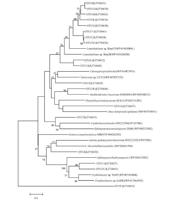 将文库phoD基因序列提交到GenBank中,序列号为(KJ710627-KJ710644).NCBI Blastx的比对结果表明,文库中phoD基因与数据库中序列的相似度较低,仅有37%~74%(表 2).phoD基因序列系统进化发育分析表明,珠江水体中的phoD基因主要来源于Limnohabitans、Pirellula、Plesiocystis等属的细菌.其中,来源于Limnohabitans属的最多,共有8个OTUs,其克隆子数占克隆文库的44%~50%;另外,来源于Pirellula属的克隆子占10.7%~15.7%,来源于Plesiocystis属的克隆子占克隆文库的11.6%~13.6%;比较特殊的是,从图中可以看到OTU9与其他微生物的相似性最小,与其最相近的菌Plesiocystis的相似度仅有37%,因此,与其他的序列都进化较远,在进化树上和其它序列独立开来(图 4).