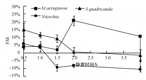 絮凝过程完成后,混合液需要经过一段时间的静置沉降而完成固液分离过程.在0.5~4 h内,随着静置时间的延长,3种藻细胞数量逐渐减少,沉降的藻细胞数量逐渐增多(图 4);四尾栅藻和菱形藻的絮凝沉降效率随着静置时间的增加而减小,铜绿微囊藻的絮凝沉降效率先稳定后增大再减小(图 5).由图 4可见,不同静置时间下,相对于空白对照组,大部分藻细胞的密度均有不同程度的下降,而且,随着静置时间的延长,沉降程度开始逐渐增大然后趋于稳定.这种现象表明:悬浮颗粒物对藻类细胞具有絮凝作用,其中悬浮颗粒物对铜绿微囊藻和四尾栅藻的絮凝沉淀效果较为明显,而对菱形藻细胞在静置沉降1 h内有效果,超过1 h,藻细胞密度反而比空白对照样高.由图 5的絮凝沉降效率曲线的变化也可以看出:悬浮颗粒物对铜绿微囊藻和四尾栅藻的絮凝沉降效果明显大于菱形藻.铜绿微囊藻的絮凝沉降在2 h达到最大20.67%,之后开始下降;四尾栅藻和菱形藻的絮凝沉降效率在前0.5 h最大,随着静置沉降时间的延长均呈下降趋势.