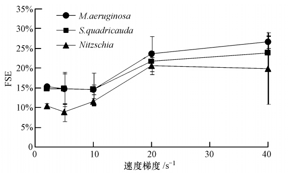 水动力条件是很多湖泊水华发生的重要影响因素,水动力降低会增加水华发生风险,如汉江水华就是在下游流量较少、流速较缓慢的时段发生的(Xie et al., 2004),太湖蓝藻水华暴发一般均在稳定大风作用过后的小风或静风、天气晴朗时段(张毅敏等,2007),说明缓慢水流有利于水华的暴发.在天然水体中,水动力增加可使水体悬浮颗粒物与藻细胞发生复杂的絮凝沉降作用,同时水动力增大也会增加水体颗粒物含量.颗粒物及藻细胞的大小、形态、浓度、zeta电位以及水流剪切力等都会对颗粒物絮凝沉降藻细胞造成影响(王洪亮,2010),水动力对藻类的絮凝沉降存在多方协同作用,如水动力增加会增大水体剪切力,改变颗粒物的大小、形态,增强颗粒物的碰撞效率等,从而影响絮凝沉降效率.水动力增大会使沉积物再悬浮,增加水体颗粒物浓度,增大颗粒物与藻类的碰撞几率,有可能降低水华发生风险.与其它两种藻细胞相比,铜绿微囊藻的絮凝沉降效率最大,这会使微囊藻水华发生的可能性小于四尾栅藻和菱形藻.