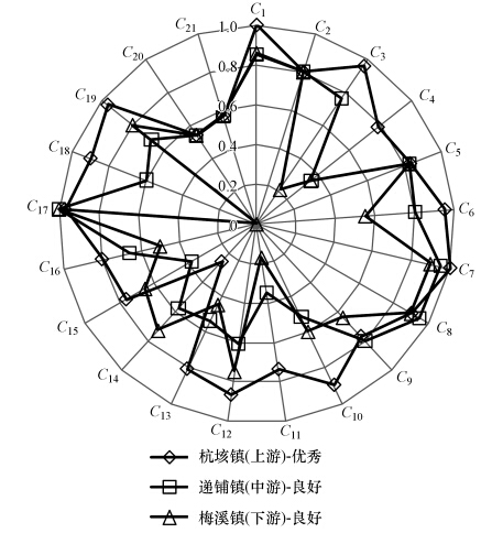 | 图 4 西苕溪流域评价指标标准化值雷达图 Fig. 4 Radar chart of evaluation index normalized value in Western Tiaoxi River watershed |