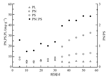 由图 2可知,在好氧颗粒污泥的形成阶段,污泥代谢产生的EPS内,多糖类物质含量逐渐升高并趋于稳定,好氧颗粒污泥形成后,其EPS内多糖类物质浓度一直保持在10~15 mg · g-1之间,EPS内蛋白质类物质含量则明显上升,由初始阶段9.4 mg · g-1升高到颗粒污泥成熟时的34.6 mg · g-1,蛋白质类物质含量提高3.7倍,同时PN/PS也由1.29升高到2.72,结果表明EPS内蛋白质类物质浓度增加是活性污泥颗粒化的重要因素.此外,在研究好氧颗粒污泥EPS时还发现,利用含油废水培养的好氧颗粒污泥EPS内还存在一定量的脂类物质(PL),其浓度基本稳定在4~7 mg · g-1之间,这可能是由于含油废水中的油脂类物质溶解于或悬浮在废水中而被好氧颗粒污泥及其EPS吸附.但是EPS内油脂类物质的存在并没有影响好氧颗粒污泥的结构和强度,好氧颗粒污泥成熟时,其颗粒强度也升高到97.0%,表明蛋白质类物质作为EPS的主要成分,有利于保持颗粒污泥的稳定性,为生活在好氧颗粒污泥内部的微生物提供适宜的生长环境.利用含油废水培养得到的好氧颗粒污泥,其内部元素含量发生较大变化,如表 1所示,培养成熟的好氧颗粒污泥内C和N的含量明显增加,分别提高了11.9%和35.5%,污泥C/N由絮状活性污泥时期的5.84降低至好氧颗粒污泥成熟期的4.82,N元素含量大幅增加表明好氧颗粒污泥内蛋白质类物质含量增多,可以促进好氧颗粒污泥的形成并有助于保持好氧颗粒污泥的稳定结构.好氧颗粒污泥及其EPS内较高的有机质浓度(蛋白质类物质和多糖类物质)表明含油废水中碳和氮有效的被好氧颗粒污泥富集,因此,可以对处理含油废水的污泥进行资源回收,对污泥资源化利用意义重大.