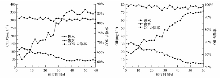| 图 3 含油废水处理过程中COD和oil变化规律 Fig.3 COD and oil removal efficiencies in oily wastewater treatment |