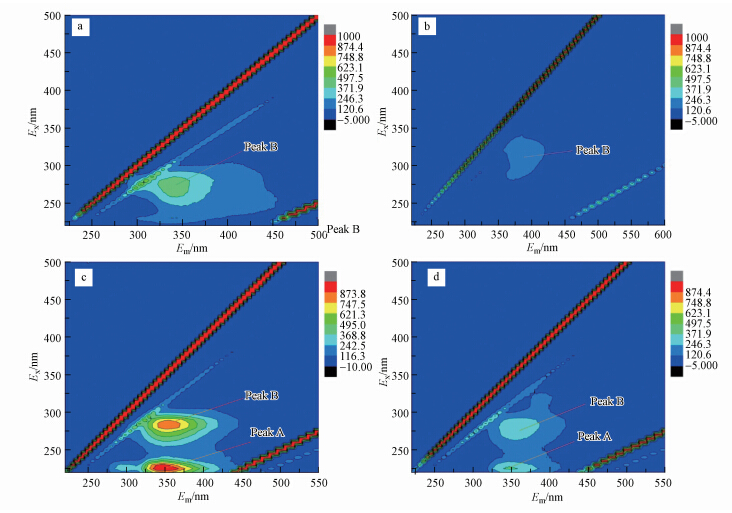 | 图 4 好氧颗粒污泥及其EPS荧光光谱谱图(a. 絮状活性污泥;b. 絮状活性污泥EPS;c. 好氧颗粒污泥,d. 好氧颗粒污泥EPS) Fig.4 Fluorescence spectrometer of AGS and EPS(a. Floc sludge;b. EPS of floc sludge;c. AGS;d. EPS of AGS) |