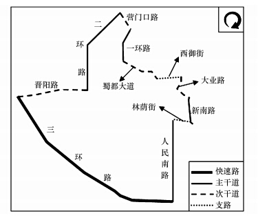 VSP分布能够真实全面的反映车辆运行工况与污染物排量之间的关系(Beevers et al.,2005),为获取轻型汽油客车的VSP分布水平,本研究在成都市区选取了快速路、主干道、次干道及支路4种道路类型,共计33.97 km作为测试路线;采用全球定位系统(GPS)对5辆轻型汽油车进行测试,测试时间为工作日,历时10 h,获取了从早上8点至下午6点不同道路的行驶特征,共获取有效数据89175条.测试路线见图 1,测试车辆的基本参数见表 5.