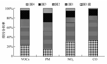 4.3 轻型汽油客车排污分担率综合表 10~13的研究结果可计算出成都市轻型汽油客车不同时期的排污分担率,结果如图 2所示.从图 2中可以看出,各时期的排污量差异较大:国1时期最大,国1前、国2、国3时期相对较小,到国4时期达到最小.VOCs、PM、NOx和CO在国1前的排放占比分别为21.8%、14.1%、30.5%和32.9%;在国1时期的排放占比分别为38.9%、38.4%、39.6%和43.0%.4种污染物在这两个时期的排放占比均超过了50%.出现这种结果不仅与各时期汽车的保有量、活动水平有关,最重要的是与各时期的排放因子有关.如国1时期油品质量低、尾气处理装置落后等因素导致其排放因子较大,加之国1时期汽油客车保有量较大,因此其尾气排放量较高.随着油品的不断升级,尾气净化效率相应提高,机动车排放因子逐渐减小,国2、国3时期机动车排污量明显减小,到国4时期其排污量最小.
