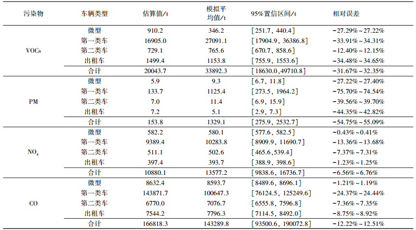 从表 15中可以看出,成都市轻型汽油客车排放清单中,PM不确定性最大,其排放总量的相对误差高达-54.75%~55.09%,且在不同车型中呈现出明显差异.例如,第一类车,PM排放不确定性高达-75.70%~74.54%,其他车型的不确定性处于-28%~43%之间,这可能是由于国家和其他的排放因子与成都地区的实际情况存在一定差异,在采用自展模拟时增大了排放因子的不确定性,从而增大了清单的不确定性范围.