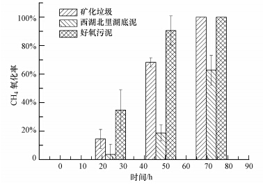 3.2 甲烷氧化菌的应用潜力 3.2.1 甲烷氧化菌在覆盖材料中的适应能力接种不同分离源甲烷氧化菌后覆盖材料的甲烷氧化速率如图 4所示,可见,接种好氧污泥甲烷氧化菌的覆盖材料在4 d内即可将浓度20%的CH4完全氧化,而接种其他甲烷氧化菌的均不能氧化完全.此外,接种有好氧污泥甲烷氧化菌的覆盖材料,其甲烷氧化速率高达388.22 μg · h-1 · g-1,而接种矿化垃圾及北里湖底泥甲烷氧化菌的覆盖材料,其甲烷氧化速率分别只有301.05 μg · h-1 · g-1和293.38 μg · h-1 · g-1. 因此,接种好氧污泥甲烷氧化菌能显著提高覆盖材料的甲烷氧化能力,同时其甲烷氧化能力显著高于其他两种(p<0.05).综上,源自好氧污泥的甲烷氧化菌在覆盖层中有最高的适应和应用潜力.
