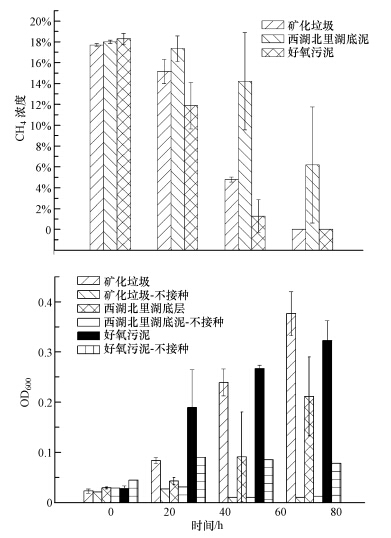 | 图 3 不同分离源甲烷氧化菌的甲烷氧化能力及生长状况 Fig.3 CH4 oxidation capacity and growth of mixed culture of methanotrophs at different samples |