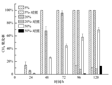 不同CH4浓度下好氧污泥甲烷氧化菌的甲烷氧化率如图 5所示.该甲烷氧化菌在48 h内即可将5%浓度的CH4氧化完全,在72 h内就可将20%浓度的CH4氧化96%,更可在120 h内将50%浓度的CH4氧化70%.由此可知,无论环境中CH4的浓度高低与否,该甲烷氧化菌都能将其氧化,而纯培养物在培养10 d后,其甲烷氧化率只有64.18%(周生芳等,2008),因此,甲烷氧化速率较纯培养物高得多.