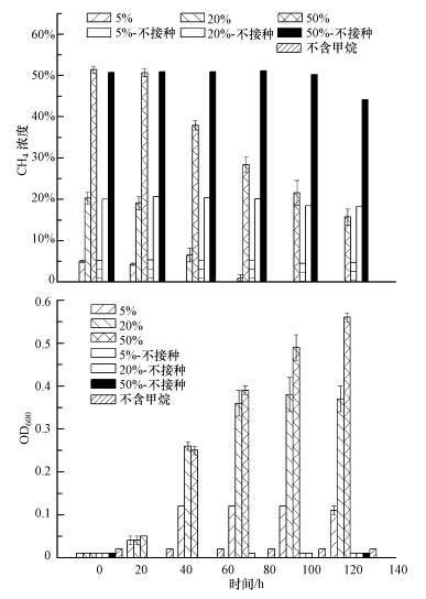 为了考察所得甲烷氧化菌在不同填埋期填埋气环境下的甲烷氧化效果,本研究设定了3个CH4浓度(5%、20%、50%)来模拟填埋后期、中期及初期的CH4浓度.移取1 mL 2.2.1节中所得最佳甲烷氧化菌培养液(使用前,菌种测定OD600值)接种于装有100 mL新鲜NMS培养液的盐水瓶中,分别注射不同体积的CH4,使CH4浓度为5%、20%、50%.每隔24 h测定CH4浓度和细胞浓度.试验设定3个平行,每个浓度设置两个空白对照,一个接种菌液但不含CH4,另外一个则不接种菌液但含有CH4.