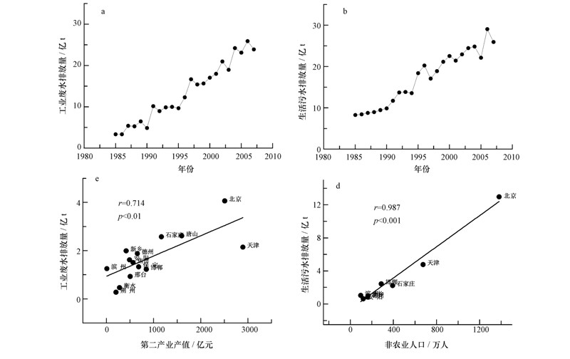 人口和经济产值大幅增长直接导致流域工业废水和生活污水排放规模迅速上升(图 4a,b).工业废水排放量由1985年的3.3亿t增加到2007年的23.9亿t,城市生活污水排放量由1985年的8.3亿t增加到2007年的25.9亿t.流域工业产值及人口数量与废污水排放规模具有明显关联性(图 4c,d).北京、天津、石家庄和唐山工业产值较高,其工业废水排放量也显著高于其它城市,工业废水排放量与工业产值之间相关性显著(p<0.01),相关系数为0.714.生活污水排放量与非农业人口数量之间相关性更加显著(p<0.001),相关系数为0.987.流域工业发展和人口扩张造成废污水排放量增加,已经成为河流水质恶化的直接驱动力.