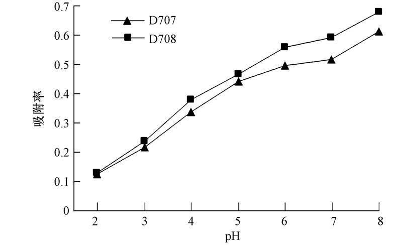 由图 1可知,D707和D708树脂对氨氮的吸附量均随pH值的升高而升高,且D708树脂的变化幅度较D707树脂大.废水中的离子交换反应可用下式表示: