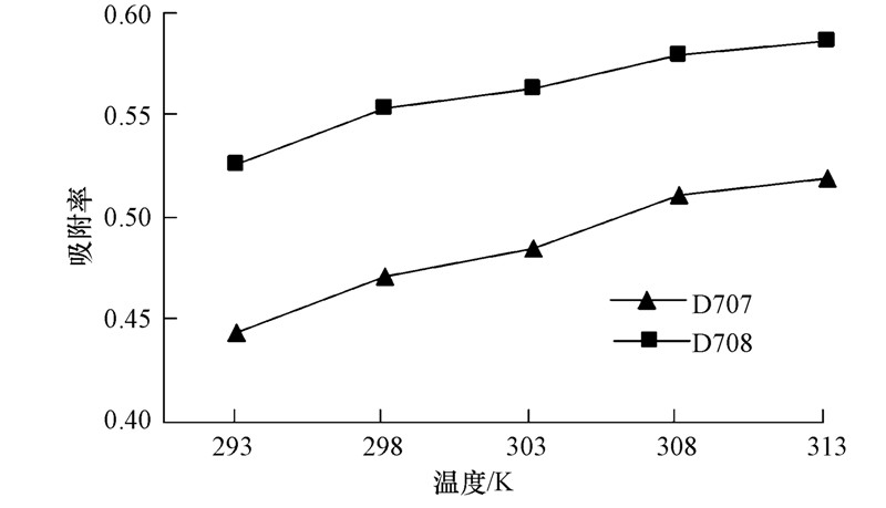 4)两种树脂对NH+4的吸附属于吸热反应,随温度的升高对NH+4吸附率逐渐增大.D707、D708树脂对NH+4的表观吸附活化能分别为54.67、34.46 kJ · mol-1,吸附过程为液膜扩散主控制.
